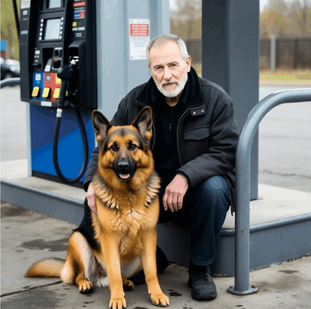 Tam, przy stacji benzynowej, siedział mężczyzna, wyczerpany i skulony. Jego ubrania były zniszczone, pokryte brudem, a twarz pełna zmęczenia, z niechlujnym zarostem, który zdradzał dni bez opieki.