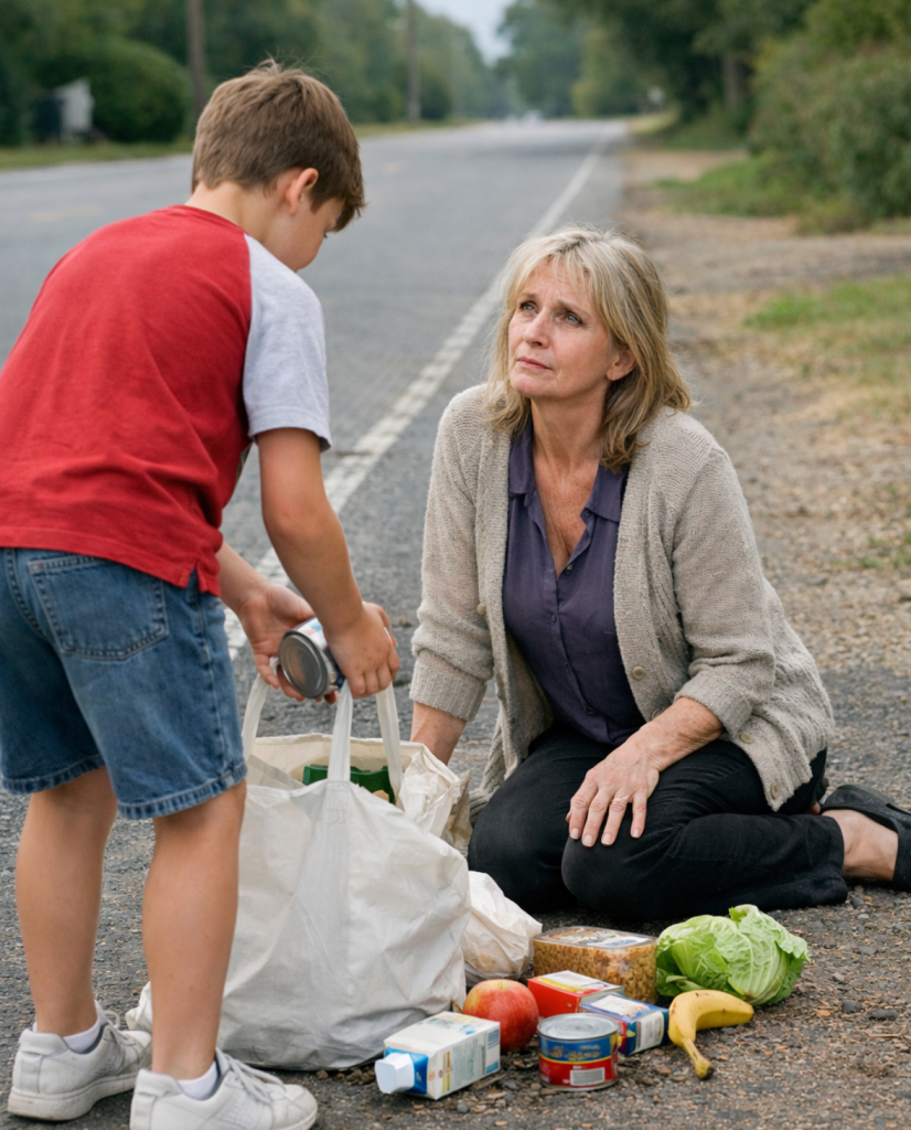 I wtedy ją zobaczyłem.Stała na skraju drogi, pół na trawie, pół na żwirowym poboczu. Torba z zakupami rozpruła się obok niej; jabłko leniwie stoczyło się po zboczu. Ręka przyciskała się do ziemi, ramiona drżały — nie z zimna, lecz z czegoś cięższego.