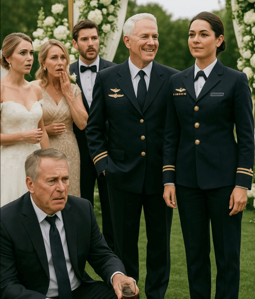 O silêncio tomou conta.Então ele disse:“Por favor, fiquem de pé… a Lieutenant Commander está presente.”No início, apenas confusão. Depois, todos se levantaram.O rosto do meu pai empalideceu; o vinho derramou-se, manchando a grama como uma ferida escura.