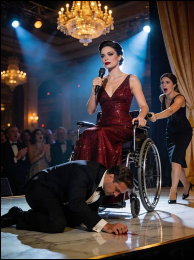 Ogromne brawa.— „I jeszcze jedno…” — zakończyła spokojnie. „Mój prawnik czeka na ciebie na zewnątrz. Podpisz dokumenty rozwodowe, zanim opuścisz mój dom.”Clara zeszła ze sceny z godnością. Siedząc w wózku, panowała nad całą salą. Ethan pozostał na podłodze,