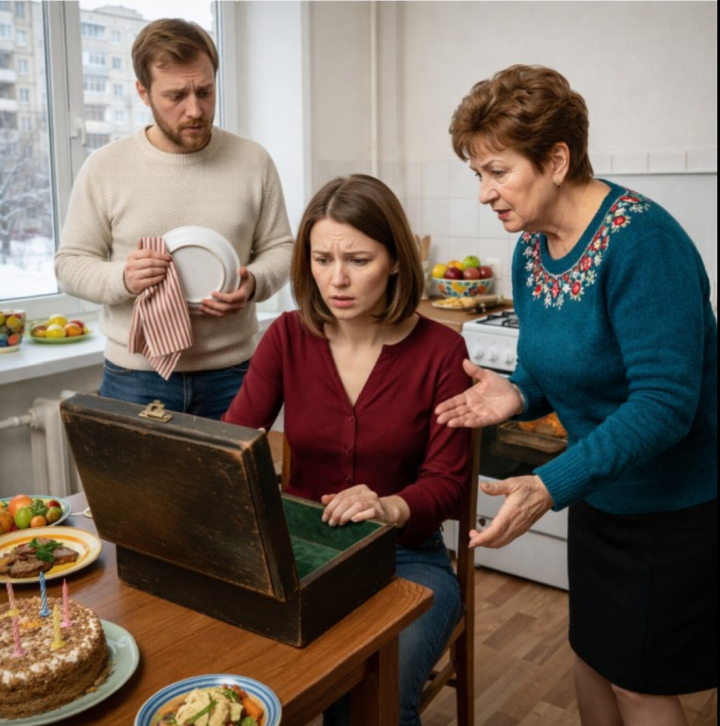 „Otwórz mój prezent pierwszy” – nalegała moja teściowa, przesuwając w moją stronę ciężkie, kanciaste pudełko. Wyglądało jak mała walizka, owinięta grubym papierem prezentowym. „Teraz.”Jej zwykle pewny, władczy głos lekko się złamał. Odwróciłam wzrok od Taissii Nikołajewnej na męża.