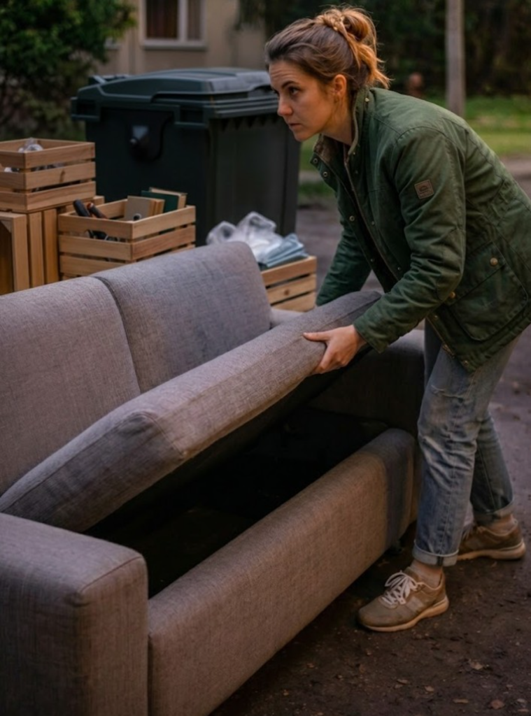 marząc o powrocie do ciepłego mieszkania, filiżance herbaty i chwili spokoju przed telewizorem.Kiedy podeszła do śmietników, coś przykuło jej uwagę. W kącie stała stara sofa i kilka czarnych worków. W tym momencie mały samochód dostawczy gwałtownie zahamował.