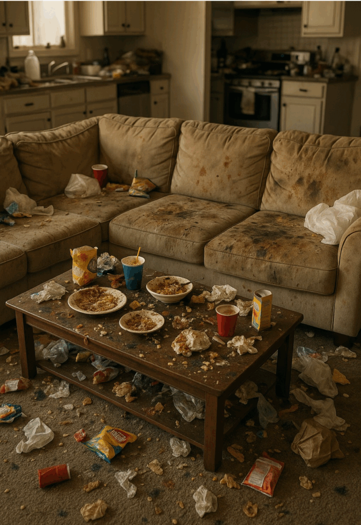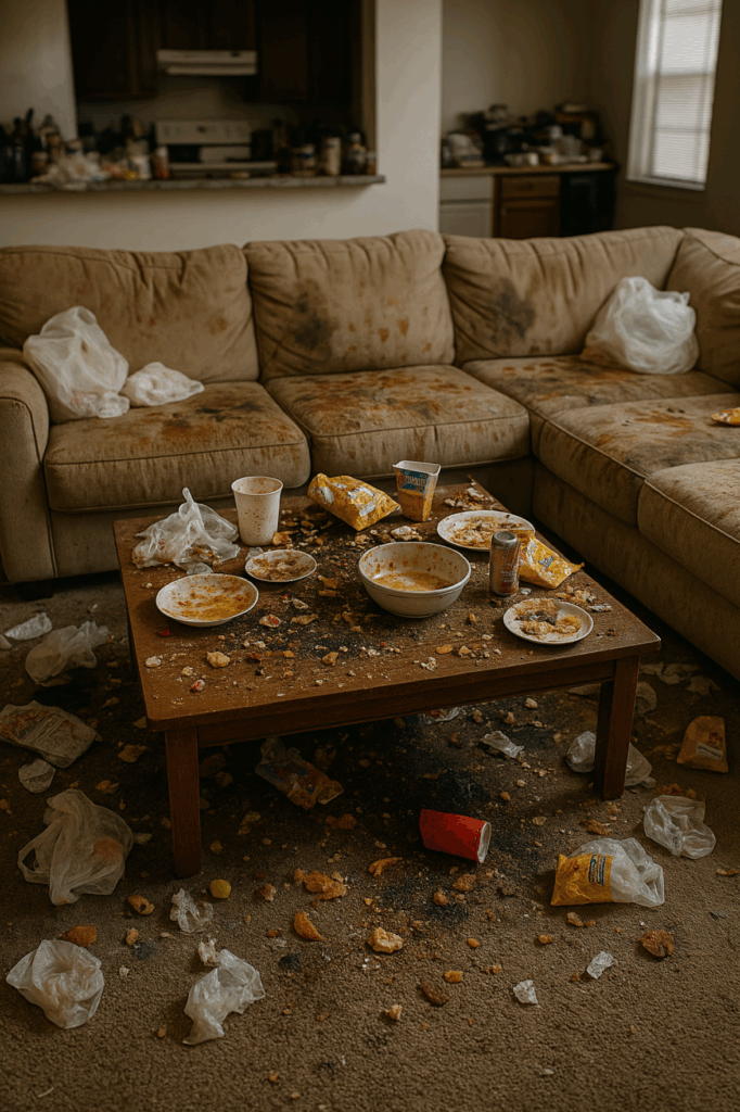 Gdy tylko przekroczyłam próg, uderzyło mnie w nozdrza przytłaczające wrażenie: ostry, tłusty zapach smażonego jedzenia, mdły, słodki aromat cukru i coś kwaśnego, co uporczywie przywarło do ścian. Mój idealny, beżowy dywan wyglądał jak pole bitwy,