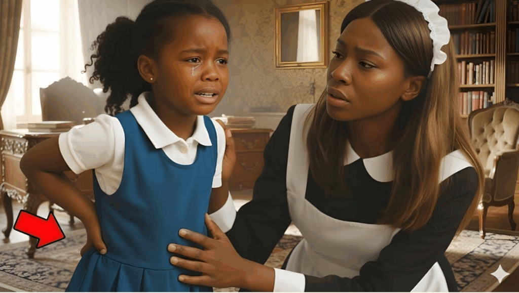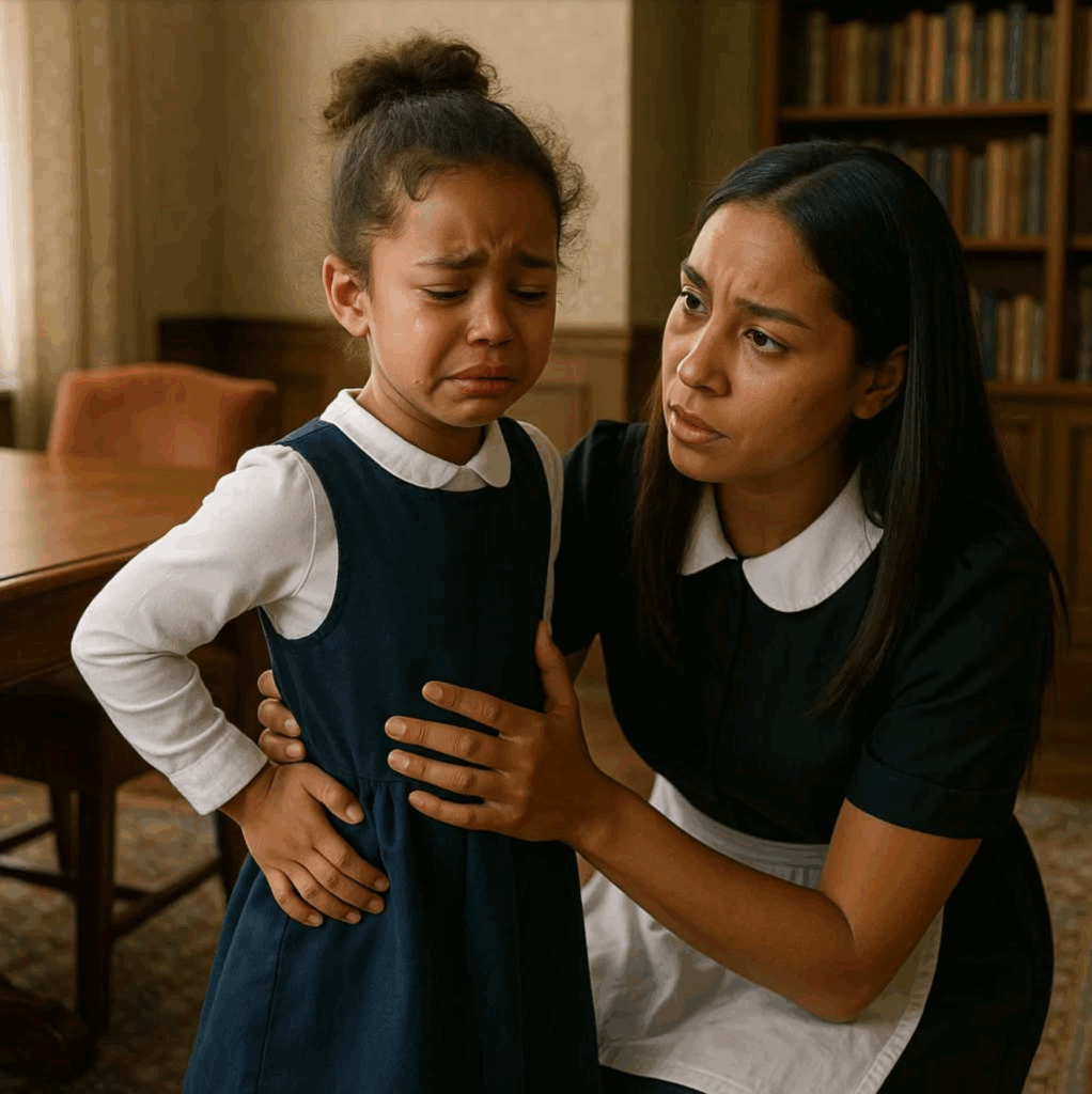 ubrana nienagannie, z delikatnymi, lecz pewnymi rękami.— „Gdzie cię boli?” — zapytała, głos drżał lekko.Dziewczynka chwyciła się za dolną część pleców, łzy spływały jej po policzkach.
