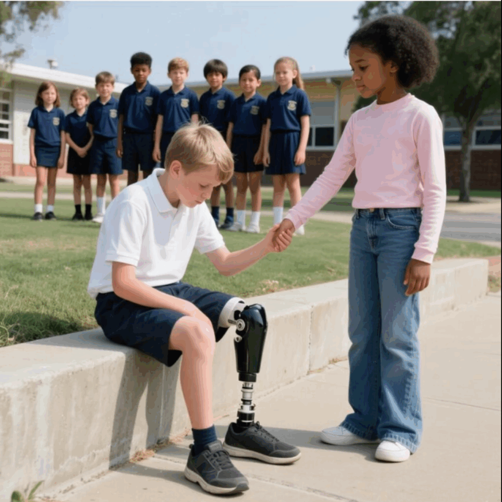 Jego staranny szkolny mundurek nie mógł ukryć niezgrabnego chodu jego protezy nogi. Każdy krok towarzyszył cichy, metaliczny klik — stałe przypomnienie, że był inny. A jego rówieśnicy nie pozwalali mu o tym zapomnieć ani na chwilę.